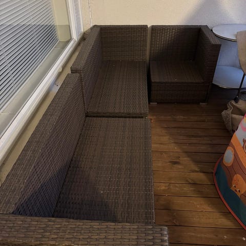 Hyväkuntoinen polyeottinki sohva ja pöytä