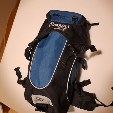 Bergansin laadukas reppu, tukiremmit edessä. Jämäkkä selässä.