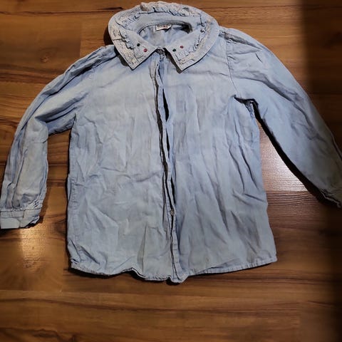 Lingon & Blåbär -farkkupaita, koko 130. Paitamaisen ohutta farkkukangasta, puuvillaa. Moitteettomassa kunnossa.