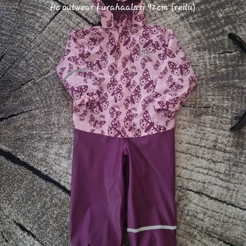 Yläosa hengittävää materiaalia ja alaosa kurahaalarikangasta. Ei paksua vuorta sisällä. Ollut viimeiseksi päiväkotikäytössä ja ainakin silloin piti meillä kuivana. Käytön jälkeen kuitenkin pesty hajusteettomalla pesuaineella, mutta vielä sen jälkeen ollut kuitenkin kerran päällä ennen kuin ostettiin isompi koko. En pessyt sen jälkeen enää uudelleen, joten alaosassa jonkun verran kuranjälkeä.