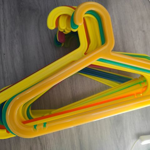 Muoviset hengarit (lasten) vaatteille. Lisäksi 2 kpl housuhengarit ja 1 tavallinen lastenvaate hengari