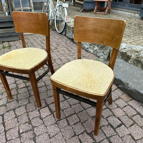 Hienot ja tukevat puiset/vaneriset vintage-tuolit, 2 kpl, 1950-luvulta. Ehjät ja tukevat, väri valkoinen. 🙂 Istuinpehmusteet vakosamettimaista kangasta, herneenvihreät, hiukan likaiset ja pölyiset. Kaipaavat varmasti vaihtoa, mikä käy näppärästi, sillä istuinosat ovat muuten rakenteeltaan aivan hyväkuntoiset. 🙂