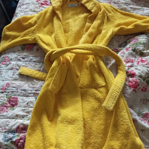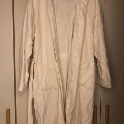 Valkoinen froteekylpytakki 140/146, merkki Bogi. Pieni tahra helmassa edessä.