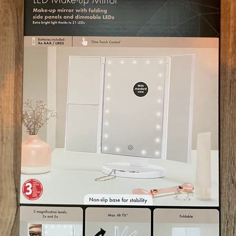 Dansanian valopeili myytäväna, oli tarkoitus meikkipeiliksi mutta ei kertaakaan ollut seinällä ja nyt vain tiellä, kytkettynä myös sähkärin toimesta valovirta kaapeli joten saa kytkettyä heti ilman asentajaa, tai halutessa myös poistaa kaapelin ja kytkeä kulpyhuoneeseen. Ei kertaakaan ollut seinässä mutta kuljetuksen yhteydesäsä vasen yläkulmasta 0.1mm siru irrotnnut, muuten käyttämätön, Tarjous kauppa