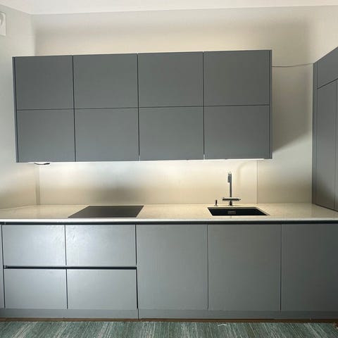 Tämä tyylikäs ja korkea kaapistokokonaisuus on täydellinen valinta lisätilaa kaipaavaan keittiöön. Vaaleansävyisessä kokonaisuudessa on Annaleena-malliston vedin, joka tuo siihen minimalistista ilmettä. Keittiö on ollut esittelykäytössä myymälässämme.