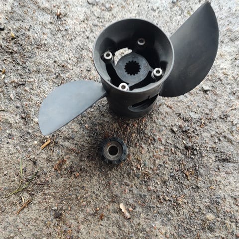 Hyväkuntoinen ballastic eteen päin. Ei jaksanu omassa veneessä kiertää tarpeeksi . Ja oma paketti liian painava joten vaihossa vois mennä 11x11-12 potkuri .