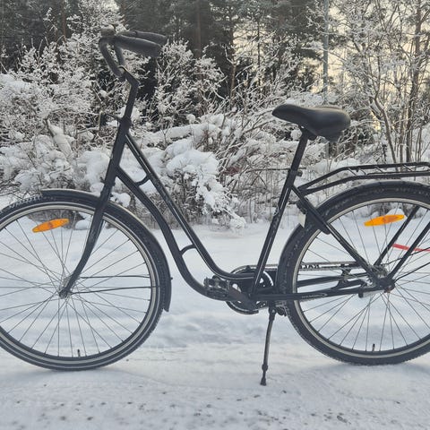 Naisten 28 tuumainen kaupunkipyörä. Kolme vaihdetta ( 3v ), lukko avaimella, tarakka, leveä satula, jalas, jalkajarru ja käsijarru. Heijastimet molemmilla puolilla. Klassikko!
