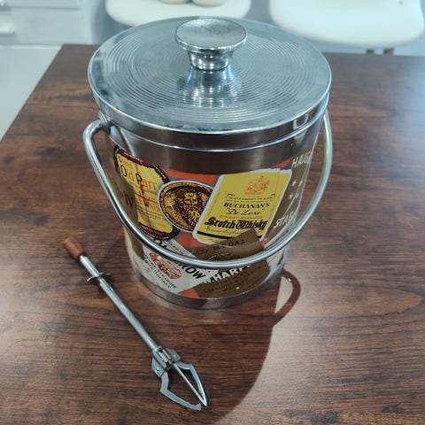 Vintage jääpalakulho. Korkeus 11,5cm ja halkaisija 9cm. Päällinen tekonahkaa ja sisusta muovia. En löydä käytön jälkeä. Nouto Saimaanharjulta 10km Lappeenrannasta. Voin postittaa mutta postikulut sinulle