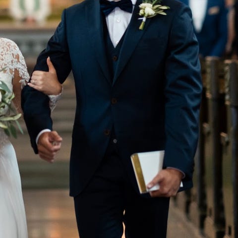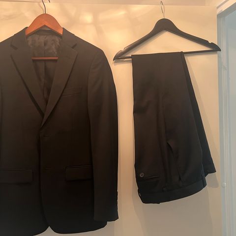 Musta 3-osainen puku. Takki ja liivi ovat samaa kangasta. Housut ovat eri kangasta, mutta ne sopivat yläosaan ja ovat erittäin saman näköisiä. Takissa kaksi nappia.