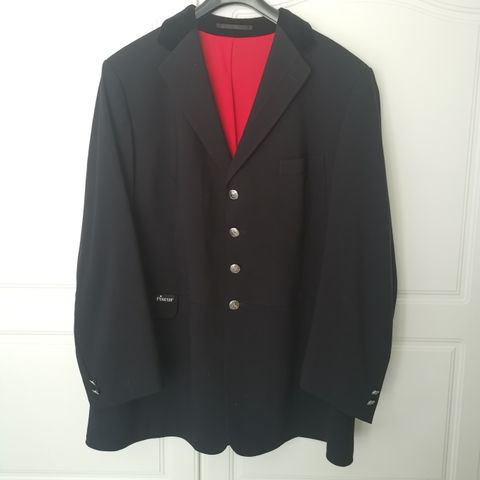 Mittatilauksena valmistettu ratsastus-/kilpailutakki miehelle kokoa 54. Väri tummansininen, sametti kaulus, jossa kultainen koriste nauha. Takana kaksi halkiota. Villakangasta, vuori 100% polyesteri. Kisatakki on vain muutaman kerran käytetty. Hienoa käsityötä ja kauniita yksityiskohtia.