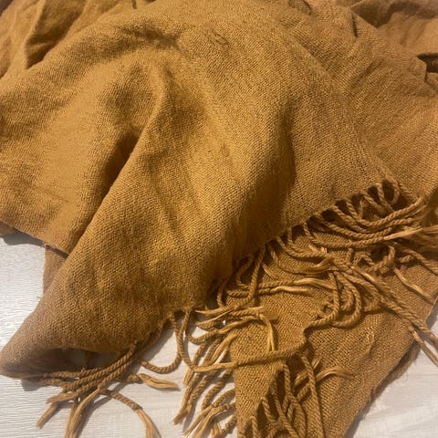 Erittäin vähälle käytölle jäänyt pitkä huivi. Materiaali 80% akryylia ja 20% villaa.