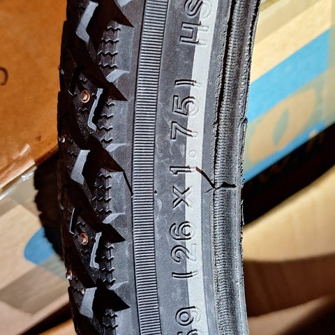 Vähän ajettu kotimainen Suomi Tyres Winter W106 nastarengas. Koko 26 x 1.75 / 1.9, 47-559. Ei halkeamia.