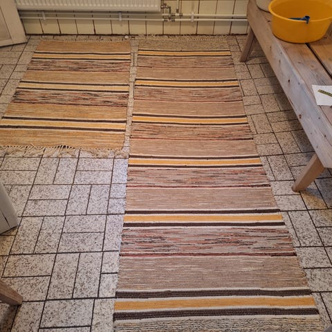 Myydään kaksi sinivalkoista räsymattoa, koko 80x200 cm.