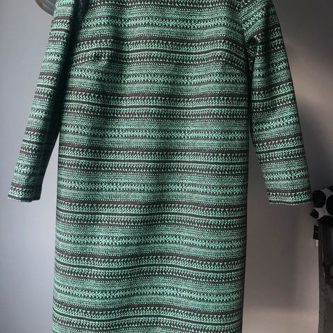 Marimekon vuorillinen, pitkähihainen mekko, jossa sivuilla taskut.