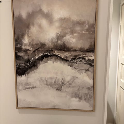Sisustustaulu 130 x 60 cm. Metallisävyjä, mustaa, tekstiä. Ostettu jokin vuosi sitten Askosta 180 eurolla.