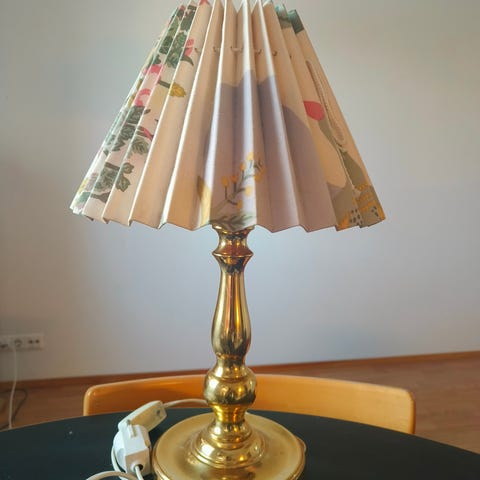 Korkea, 1,3kg painava messinkinen pöytävalaisin. Varressa roikkuva katkaisin. Lampuksi sopii kannalla E27 varustettu lamppu ( ei sisälly), eli se tavallisin. Pistoke ja kaikki johdot ovat alkuperäiset ja turvallisuuden vuoksi syytä vaihtaa uusiin.