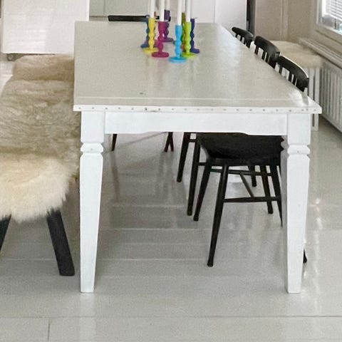Large white dinning table needs one leg to be fixed in position,otherwise in good condition and cheap price. The leg is available, just needs to be fixed back.