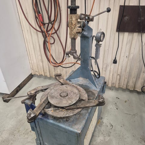 Laadukkaat Hoffman rengaskoneet suoraan ammattikäytöstä korjaamon lopettamisen vuoksi. Rengaskone apuvarsilla ja paineisku pöydällä.