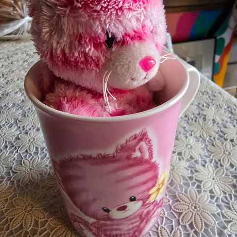Komia muki kilikellolla. Kellossa hieman ruostetta mutta toimii tai sitten ottaa kellon pois.