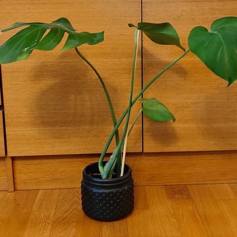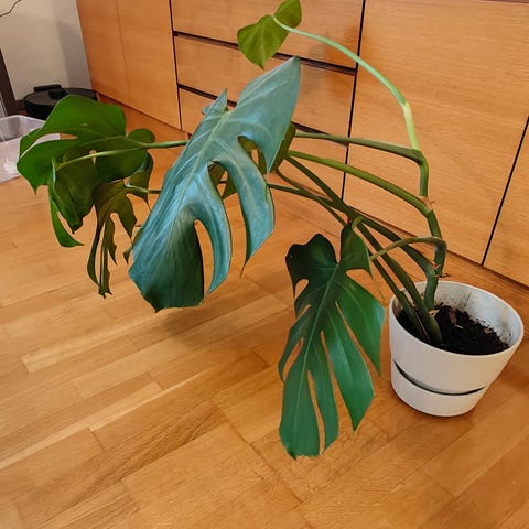 Suuri Peikonlehti, joka puhdistaa huoneilmaa. Tästä saat monta pistokasta. Korkeus on noin 1 m. Kukan hinta sisältää valkoisen Orthex altakasteluruukun, jonka halkaisija on noin 17 cm. (Kuvassa altakasteluruukku on laitettu koristeruukun sisään). Osa lehdistä jo ruskettunut.
