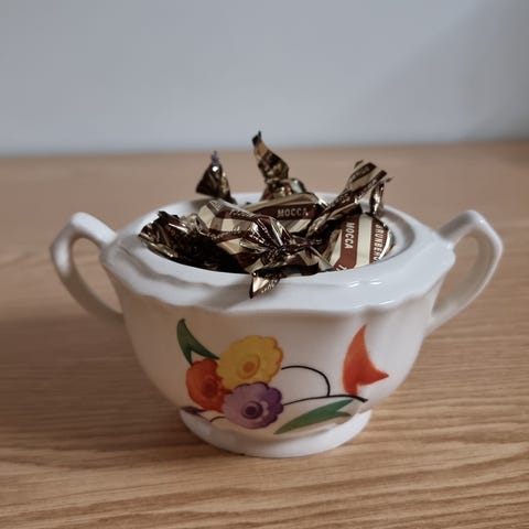 Kaunis sellaisenaan koristeeksi tai johonkin käyttöön. Valitettavasti tästä ”hattu” kadonnut ja sokerikko itsessään on hyvässä kunnossa.