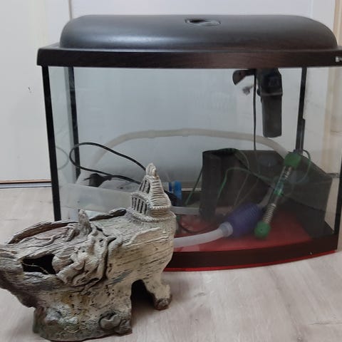 Juwel akvaario (160 l), joka sisältää akvaarion, jalustan, 2 ruokinta-automaattia, ruokaa, vedenparannusaineita, kasviravinnetta, suodattimia, tiivisteitä, tekokasvit, koristeet, ulkoinen suodatin (Eheim Professional) , lämmitin, kuplakone jne.