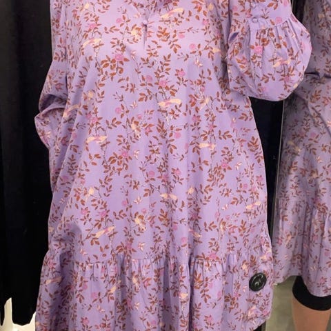 Cubuksen kokoa 42, mutta vastaa paremmin kokoa 40. Kangas ei anna periksi, mutta vyötärölle solmittavalla nauhalla saa toimimaan eri mallisilla. Olen käyttänyt tätä myös koossa 36. Vaalean vihreä pohjaväri, jossa kukkia. Ylhäältä alas asti satiinivuori niin ei näy läpi.