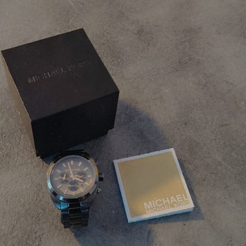 Miesten michael Kors kello mustalla kumirannekkeella. Vähän käytetty, muutama naarmu mutta muuten hyvässä kunnossa. Toimii mutta patteri pitää vaihtaa. Nouto Munkkiniemestä.