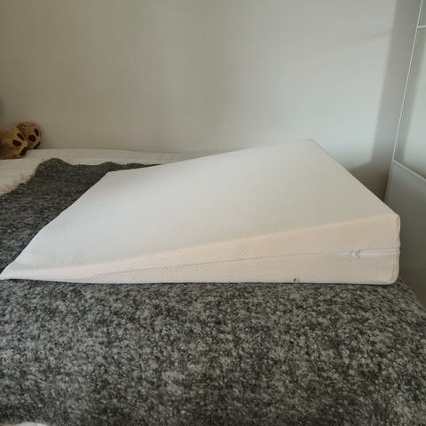 Tampereen vaahtomuovista tilattu 80cm, 15cm korkeimmalta kohdalta oleva kiilatyyny, tai toiselta nimeltään refluksityyny. Kuin uusi, jäi lääkityksen avun vuoksi tarpeettomaksi, oli käytössä petauspatjan alla noin 1kk. Päälisen saa pestyä, siinä on vetoketju.
