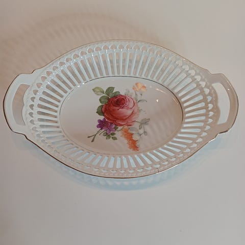 Tehdas Lampisen Turussa valmistama tarjoilulautanen 28 x 18 cm. Valmistettu 1928-1946. Yläosan kultareunus kulunut lähes kokonaan pois. Pohjassa pieni lohkeama. Yksi ilmakupla / reikä sisäpohjassa. Virheet näkyy kuvissa.