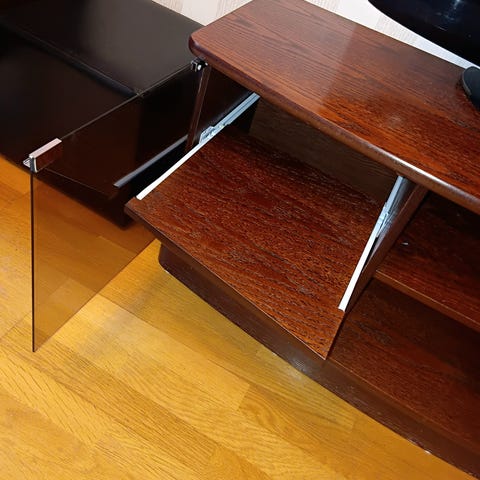 Myydään valkoinen, kiiltäväpintainen ja moderni tv-taso. Kolme hyllyväliä, joista keskimmäisestä mahdollista pujottaa johtoja.