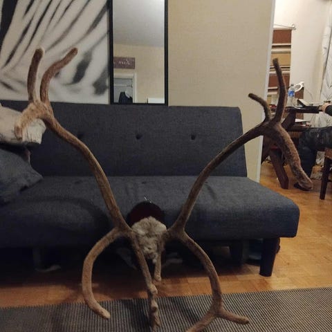Parhaiden peurapukkien sarvikokoelma 12 kpl hienosti aluslaudalle asetettuina.