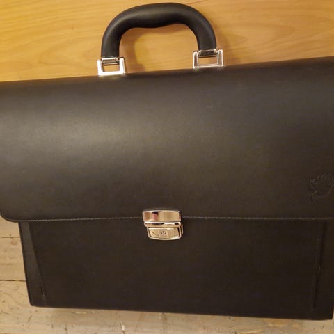Tyylikäs ja käyttämätön musta nahkasalkku, joka sopii erinomaisesti työhön tai opiskeluun.