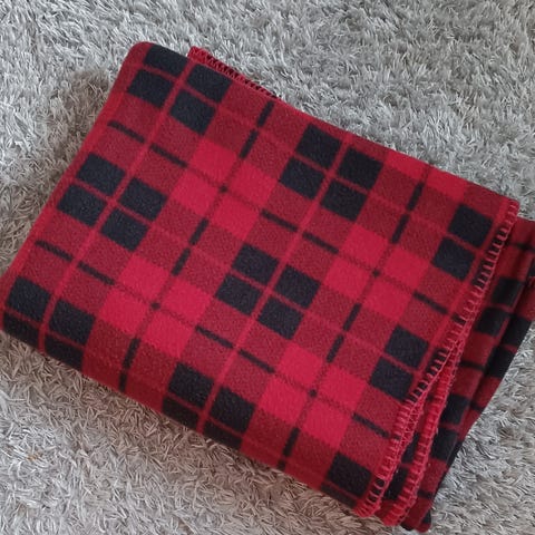 Käyttämätön sini-valkoruudullinen fleece-huopa paketissaan (mitat: 135 cm x 175 cm).