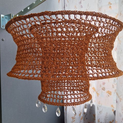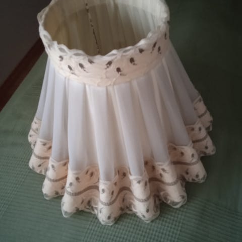 Oheinen lampunvarjostin seuraavalle sisustajalle.Materiaali nailonia tai vastaavaa.Reunassa helmikoristeita.Mitat korkeus 23cm,lev.20cm. Nouto Kivistönmäeltä,käteinen.