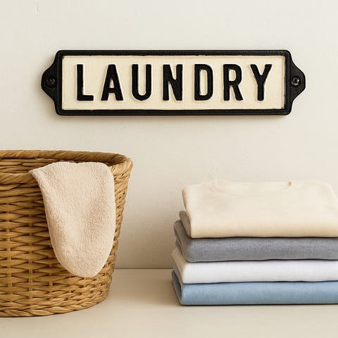 Iso vanhan ajan tyylinen kyltti ”Laundry room”. Materiaali alumiinia, päälle 2D printattu. Koko 40 x 10cm.