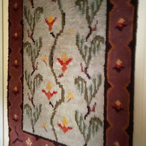 Hyvässä kunnossa oleva seinäryijy Sammaleenkukka, 110 x 150 cm. Neoviuksen mallistoa , 50- luvulta , suunnittelija Unto Ivaska.