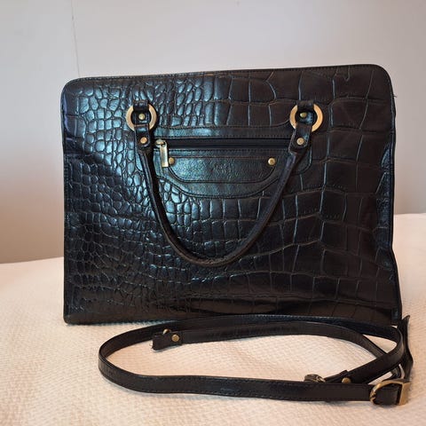 Näyttävä kirjekuorilaukku metallisin yksityiskohdin. Mustaa, eläväpintaista nahkaa. Kiinnitys vetoketjulla, sekä magneetilla. Metallinen olkahihna/ketju.