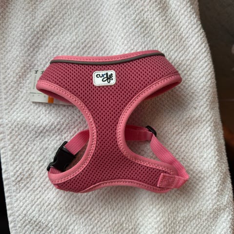 Curli-merkkiset valjaat koiralle. Hankittu mopsille, mutta olivat hieman liian napakat. Kokeiltu vain, ei olleet käytössä. Silti voi muutama karva löytyä.