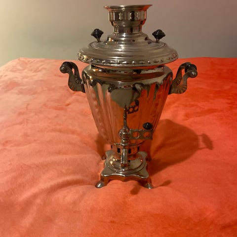 Myydään valkoiseksi maalattu samovaari maalaisromanttiseen kotiin.