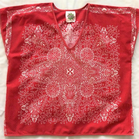 Paita käy monen kokoiselle kokoon XL asti riippuen siitä, miten se haluaa istuvan. Koko 44, tässä mittoja: rinnanympärys n. 126 cm, vyötärö n. 124 cm, hartiat n. 45 cm, hiha n. 65 cm, pituus niskasta helmaan n. 79 cm.
