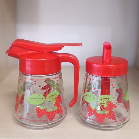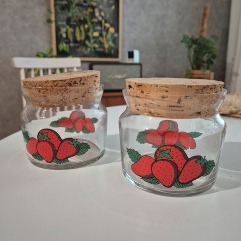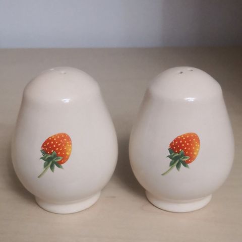 Mansikka-aiheisia astioita.
