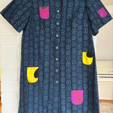 Myydään ompelijan ompelema Marimekon Henriikka kankaasta tehty mekko. Mekossa kiva frillahelma.