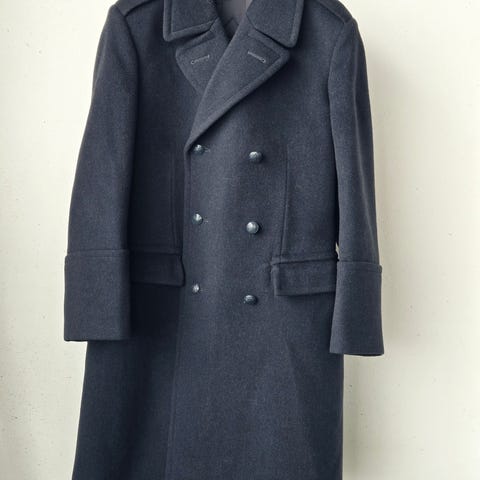 Myydään hieno sarkatakki jossa vuoren virkaa toimittaa lampaantalja. Korkeat kaulukset ja vyö. Pääosin hyvässä kunnossa, mutta taljan ompeleet irronneet helmasta. Mittoja kuvissa.