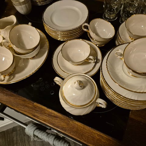 Uutta vastaavat Arabian kultakoriste kahvikuppiparit 12kpl, leivoslautaset 12 kpl sekä sokerikko ja kermakko.