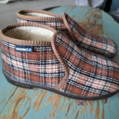 Myydään sinisävyiset Reino-tohvelit koossa 36. Kummankin kengän kärjessä pientä käytön jälkeä: vasemmassa tohvelissa kengän pinta kulunut, oikeassa tohvelissa pohjan repsottanut osa kiinnitetty takaisin. Näkyy hyvin 4. kuvassa.