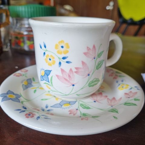 Myynnissä kuvassa näkyvä 10kpl kahvikuppisetti, tasseineen. Yksi tassi hieman erilainen kuin muut, siitä kuva. Ainakin kahdesta kupista ja kolmesta tassista puuttuu palanen/palasia