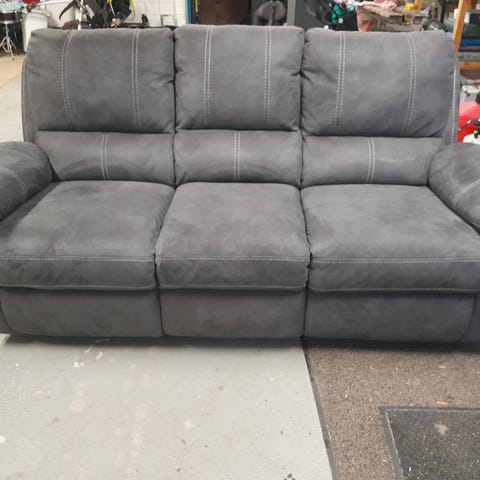 3 istuttava tummalla kangasverhoilulla oleva mekanismi sohva. Molemmissa reunoissa toimivat mekanismit, joissa saa tosi rennon löhöasennon.