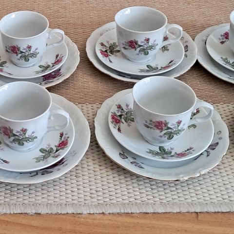 6 kahvikuppia, 5 lautasta ruusukuvioin. Pieni siru lähtenyt yhdestä lautasen reunasta.