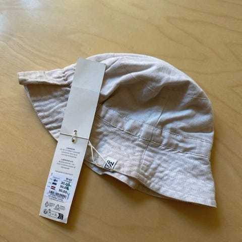 Liewoodin aurinkohattu puuvillaa (55%) ja pellavaa 45%. Haalean vaaleanpunainen, tosi nätti! Meillä käytetty puolivuotiaasta reilun vuoden ikäiseen